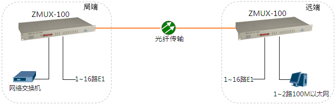局端站與遠端站間通過光纖點對點通訊。局端站1~16路E1接口(2M接口)及1~2路共享速率100M以太網(wǎng)接入到ZMUX-100后轉(zhuǎn)換成光信號,再連接上光纖傳輸?shù)綄Χ苏具€原出來。