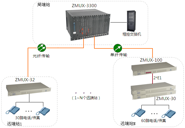 遠端N的ZMUX-30接入60路電話(可選配其它業(yè)務(wù))復(fù)用成2路E1信號,通過E1接口(2M接口)級聯(lián)ZMUX-100,再轉(zhuǎn)換成光信號,通過光纖傳輸?shù)綄Χ巳ァ?/p>